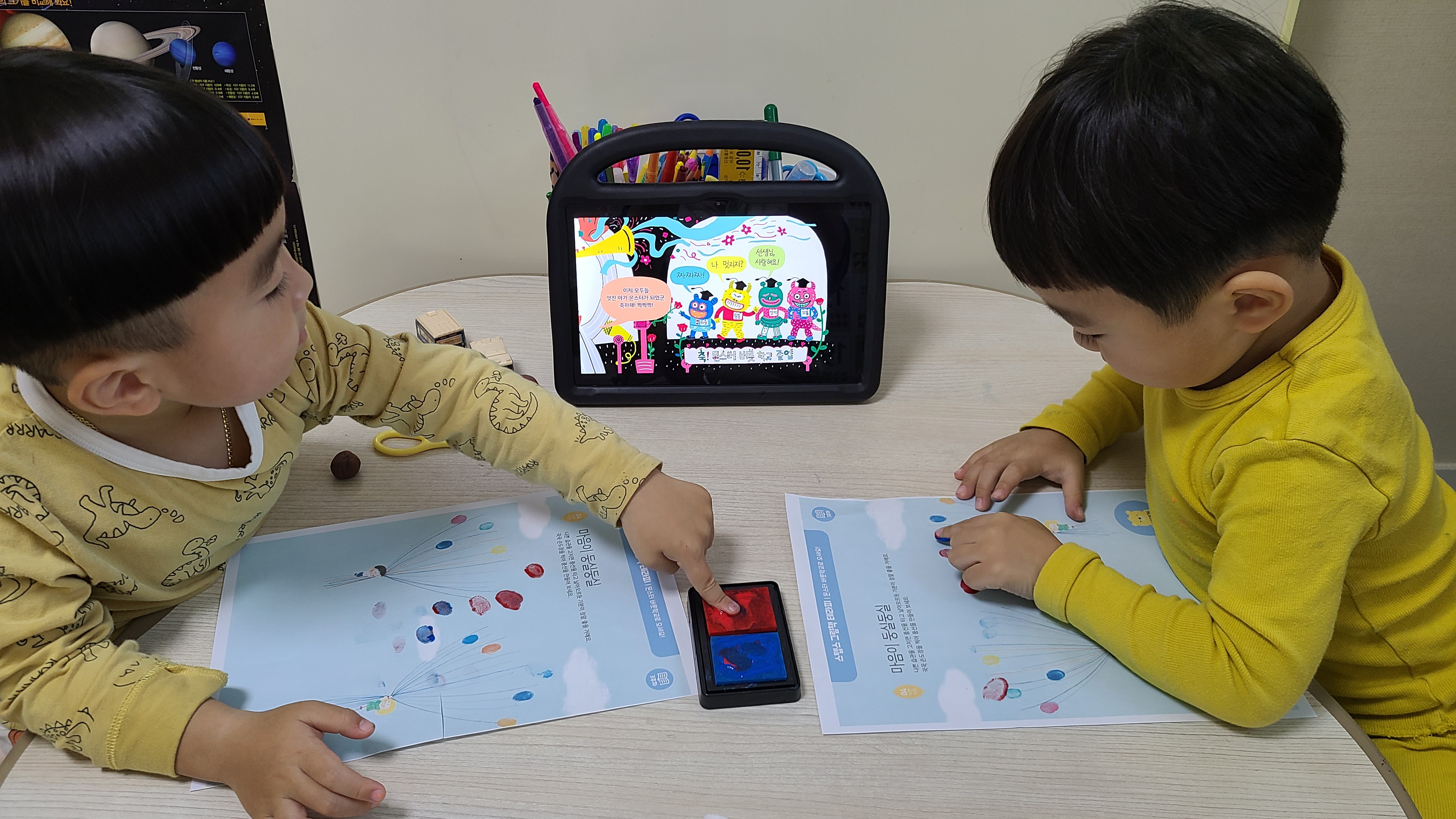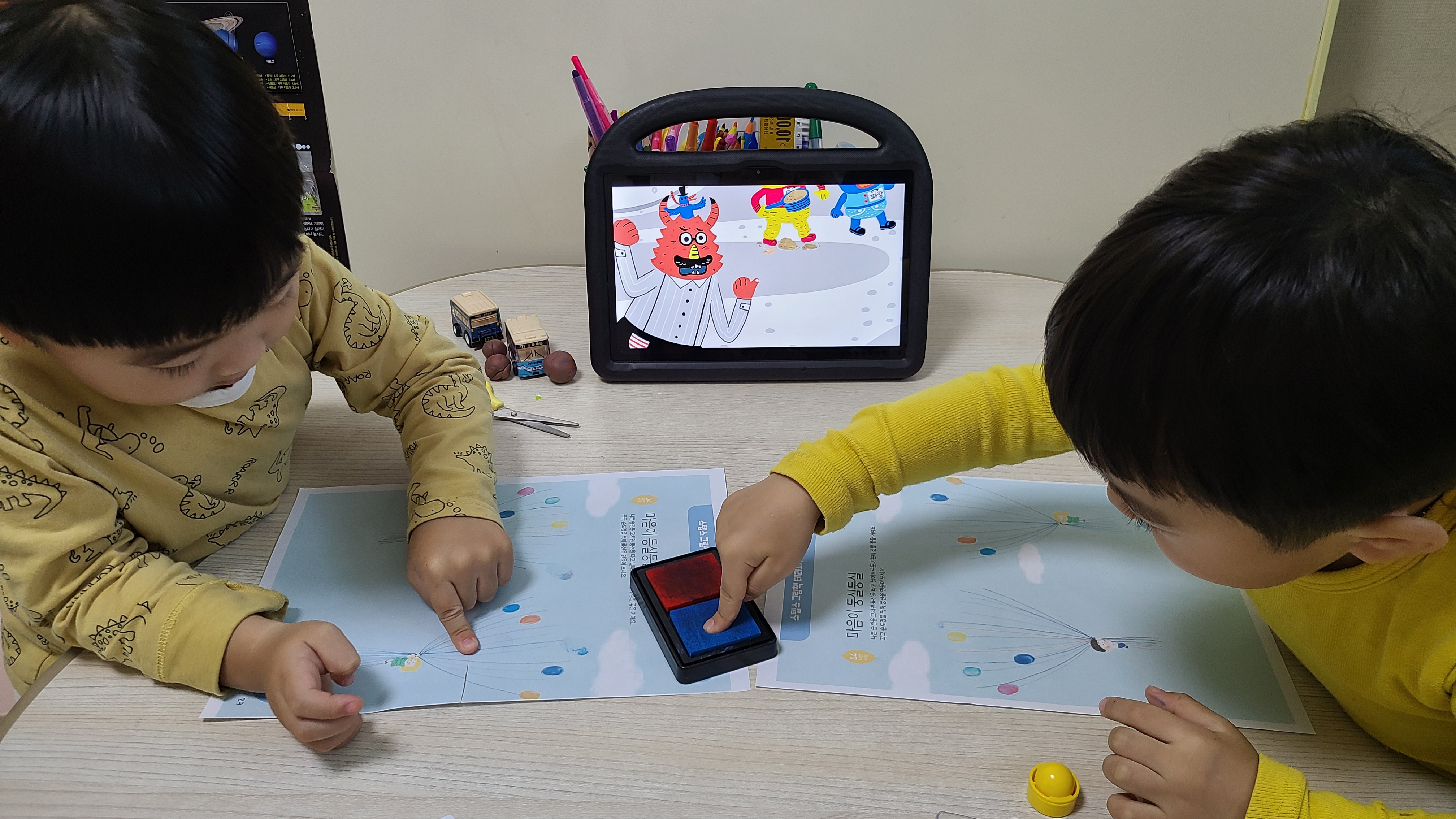 몬스터 버릇학교로 오세요현이가 요즘 한번씩 손가락을 입에 넣거나물고 있을 때가 있는데 그럴때 한번씩 보여주고싶은그림책이랄까?손가락으로 도장 쿡 찍어 풍선 만들기!!