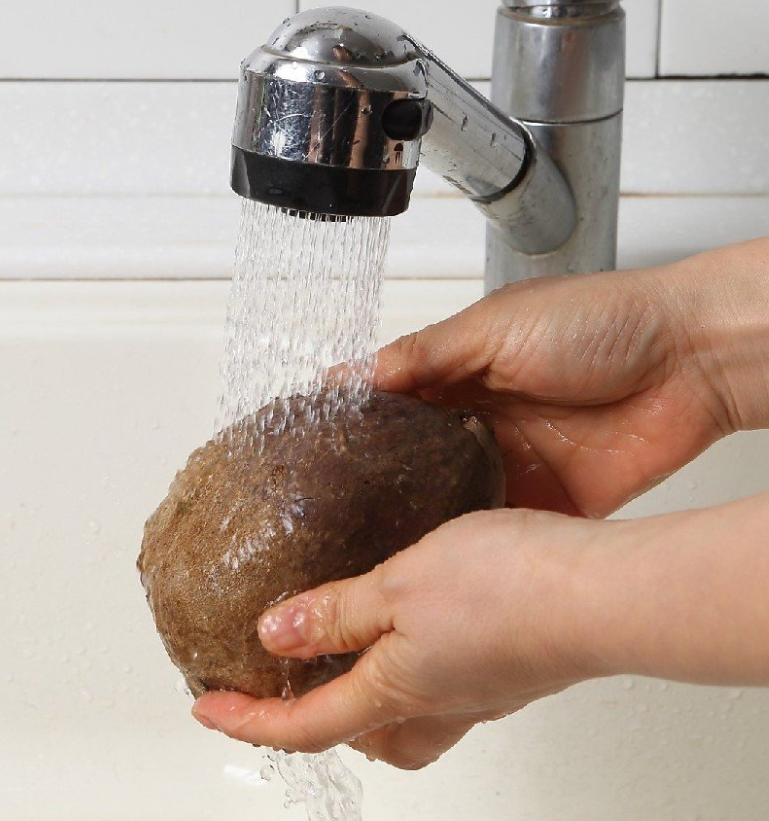 수확한 지 얼마 안 된 것은 흙이 많이 묻어 있고, 잘랐을 때 붉은색이 선명하게 드러난다.