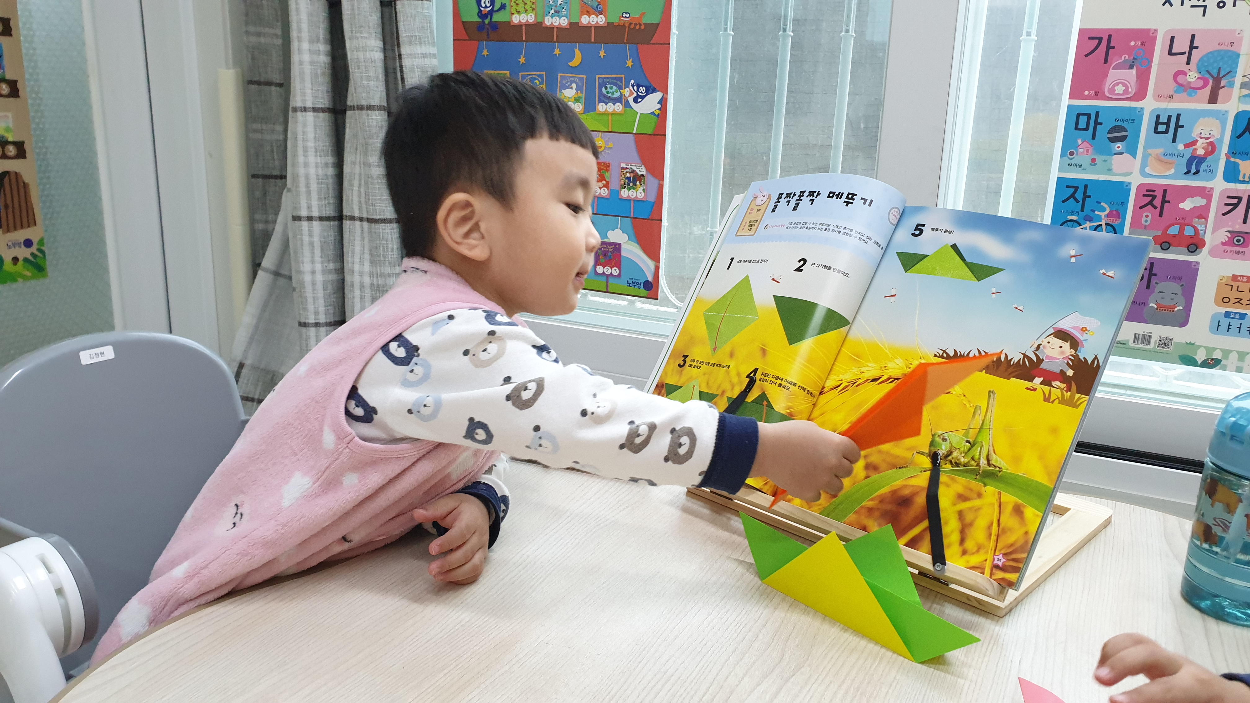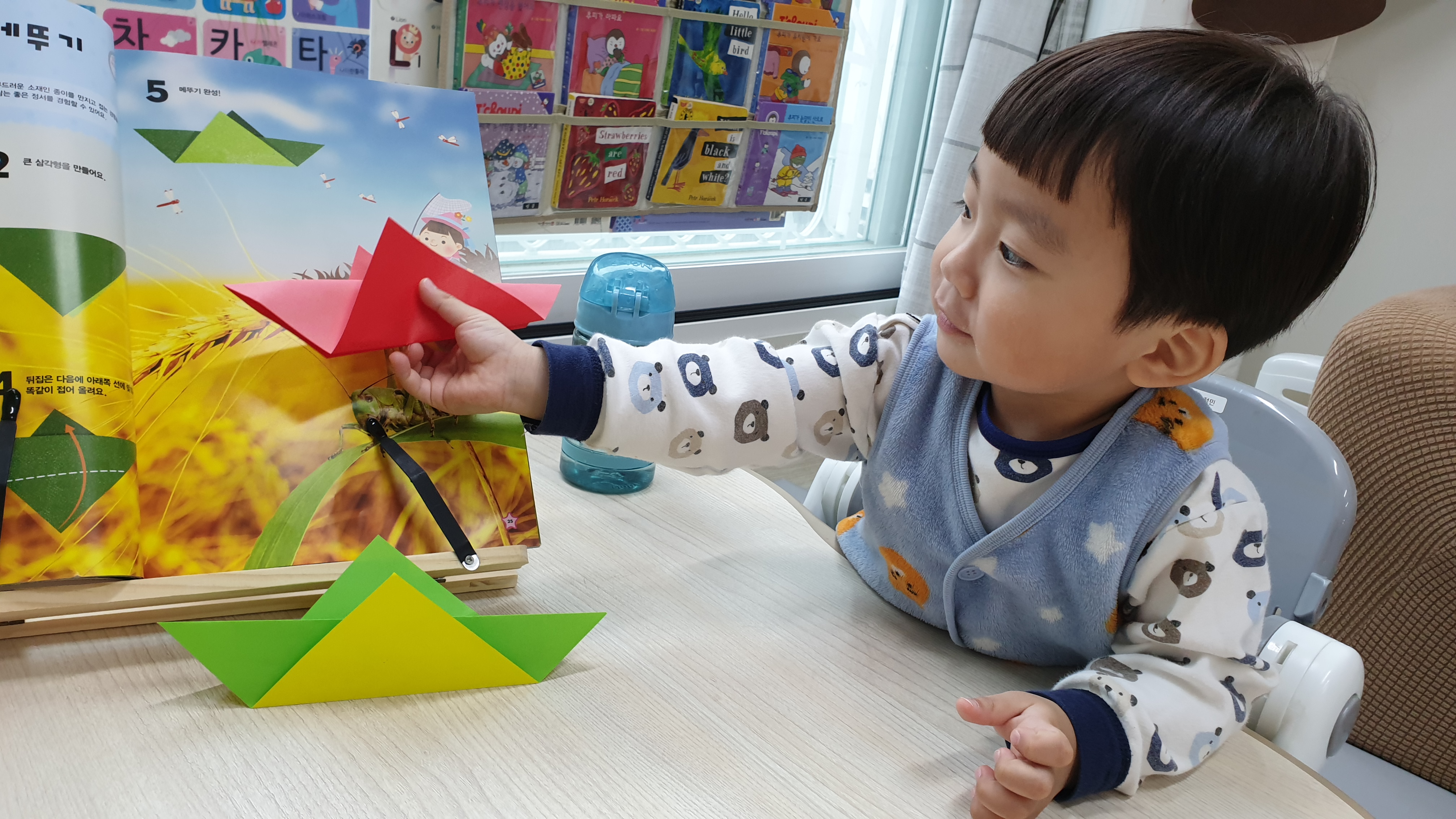 접을때 위로, 아래로, 꼭지점, 꾹꾹꾹 말로 설명하며 접어준다