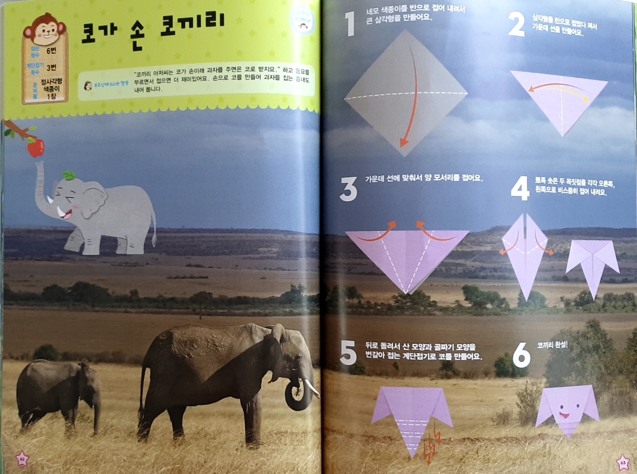 💚 아이활동 및 후기 : 우리 아이들이 제일 좋아하는 동물 코끼리이다. 코를 접을때 계단접기를 해야하는데 이것 또한 엄마가 다 해줘야 한다. 눈 입을 그려주니 푸~ 소리를 내며 너무 좋아했다!